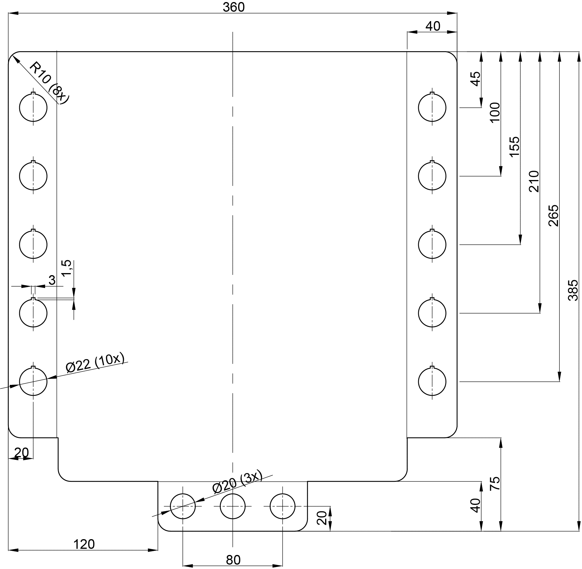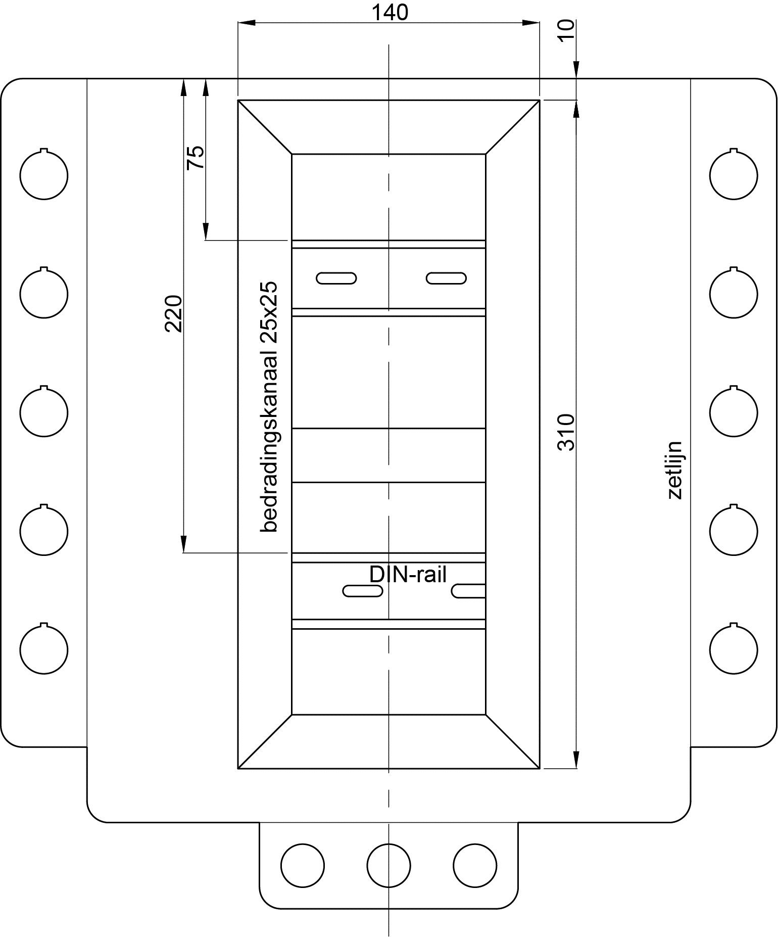 Indien u geen montageplaten heeft van voorgaande cspe’s, dan dient u voorafgaand aan het cspe de montageplaten te maken en daarop een bedradingskoker en DIN-rail te monteren. Zie de tekeningen hieronder. U kunt gebruikmaken van het onderstaande dwg- of dxf-bestand om de montageplaten machinaal te maken of te laten maken.